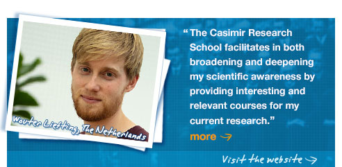 Casimir Research School - Leiden University's and Delft University of Technology’s joint research school in physics - brings together over 320 PhD students, 130 postdocs and 100 faculty members. The school's research program is developed by groups at the Kavli Institute of Nanoscience in Delft and at the Leiden Institute of Physics (LION). Casimir, established in 2004, is named after Professor Hendrik B.G. Casimir (1909-2000), whose involvement in fundamental physics as well as applied physics left many traces in the Dutch scientific landscape.